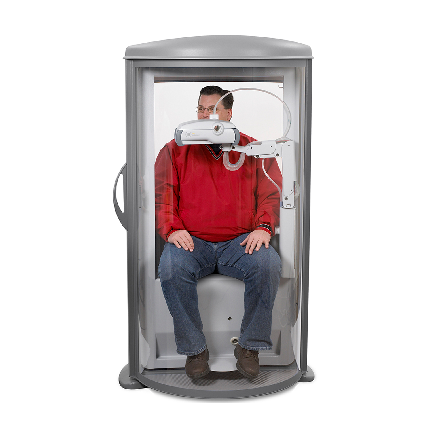 El pletismografo elite ofrece un diseño único de apertura de la puerta que no requiere de espacio adicional. Si el espacio es limitado dentro del laboratorio el sistema lo libera de la preocupación de tener que reservar espacio para la apertura de la puerta gracias a su novedoso sistema de puerta giratoria. Eso no impide que usted pueda testear pacientes de hasta 180 kilos de peso y 2 metros de altura.